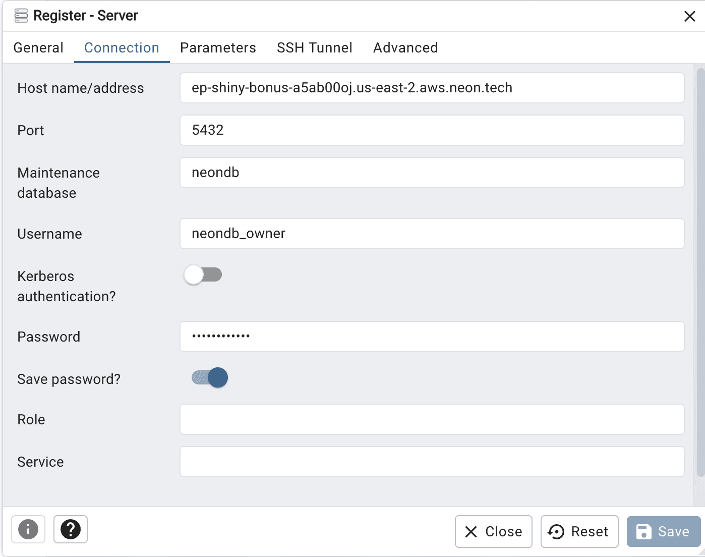 - Host: The endpoint of your hosted Postgres database (e.g., ep-...us-east-2.aws.neon.tech).