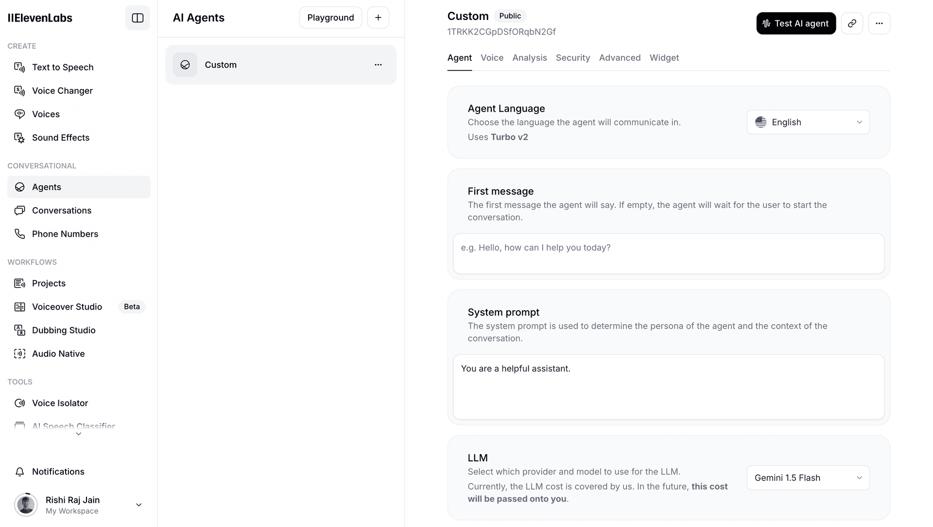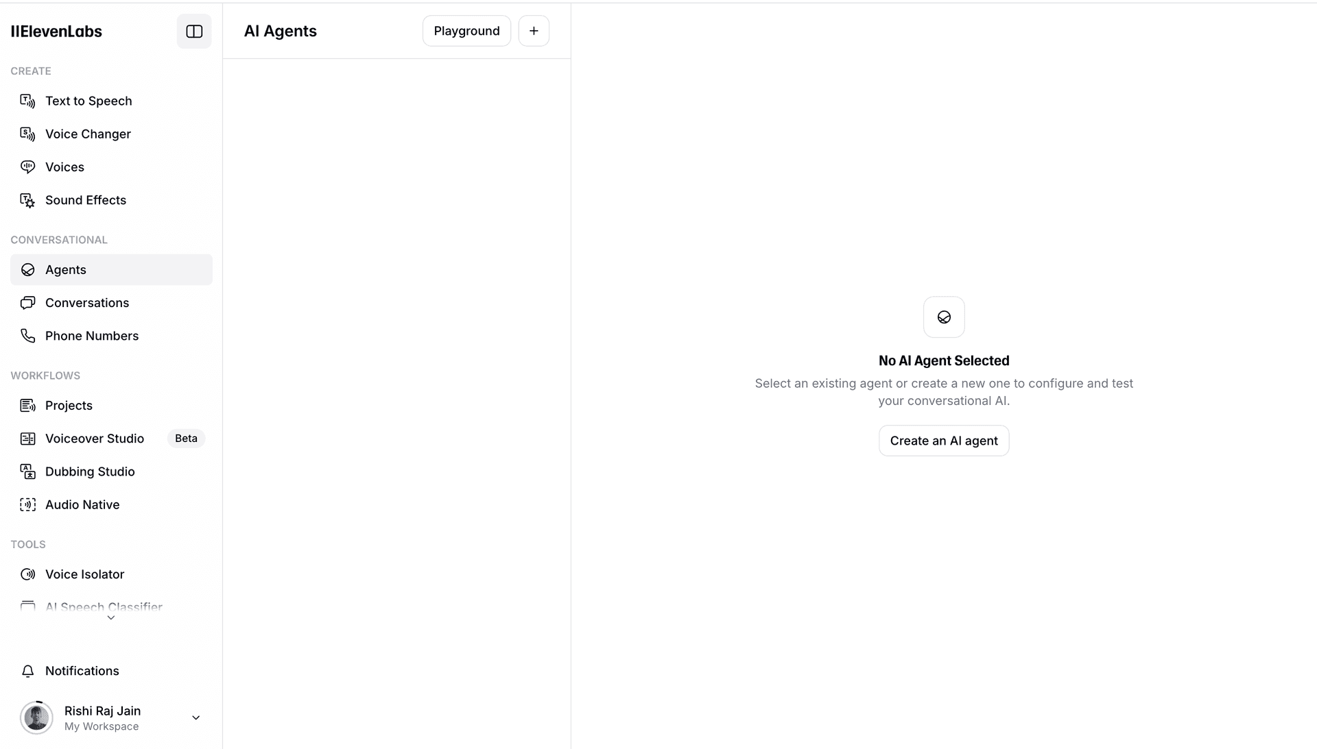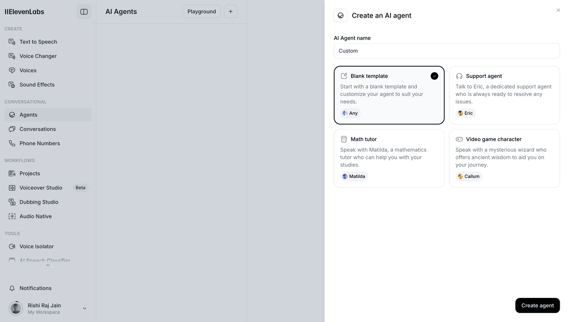 To create a customizable agent, go to ElevenLabs' AI Agents and then click on Create an AI agent button.